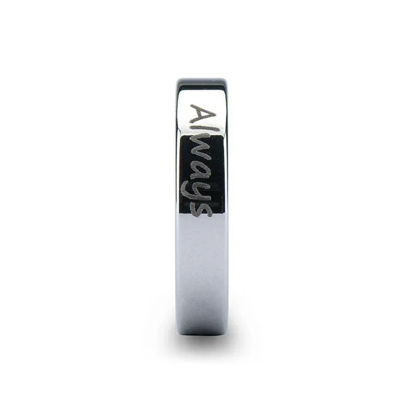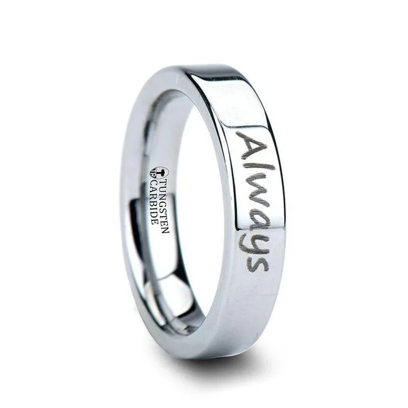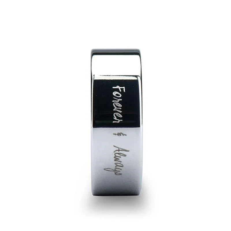 Handwritten Engraved Flat Pipe Cut Tungsten Ring Polished - 4mm - 12mm