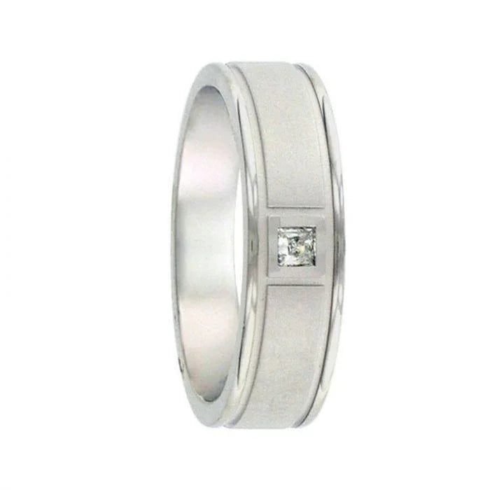This is a fascinating wedding band made with fine 14k white gold. This flat band features a satin brushed finish with dual grooved accents along the edges. The highlight of this stunning ring is the center princess cut white dazzling diamond. The 6.5 mm width ring also features rolled edges for a nice comfort fit. This piece is a great choice for men and women to symbolize their marriage commitment with class. The diamond color is G-H grade with a clarity of SI1-SI2. This style is also available in a variety of other metals. All Artcarved Rings come with a lifetime warranty that covers resizing and/or replacement in case of accidental damage for a shipping, handling and processing fee.