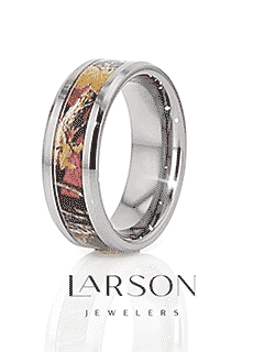 This is an awesome tungsten carbide wedding band with a hand designed pink oak leaf camo inlay. Extremely durable with beveled edges, this pink oak camo tungsten ring is a definite eye catcher.