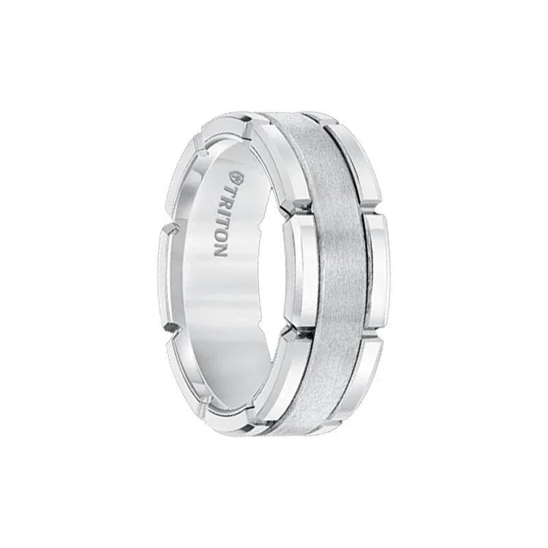 White Tungsten Carbide Flat Comfort Fit Band with Brushed Center and Bright Rims by Triton Rings - 8mm