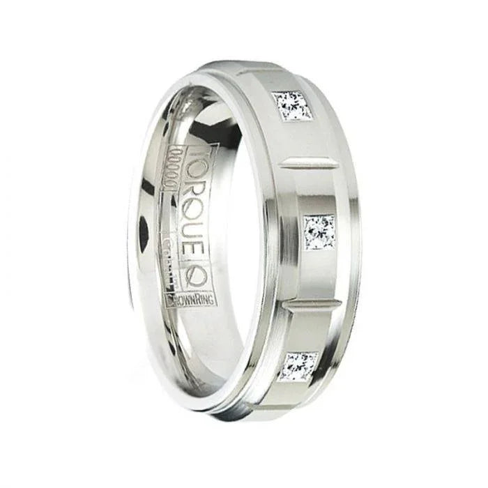 This ravishing wedding band by Crown Ring displays three round cut diamonds with a total carat weight of 0.12 and I1 clarity. The polished beveled step edges lead into a raised matte center that is intricately detailed with horizontal grooves. This ring is available in a 7mm width. Larson Jewelers is proud to display this ring as part of our diamond wedding band collection. This ring is covered by a lifetime Crown Ring warranty that covers scratching, breakage and manufacturing defects.