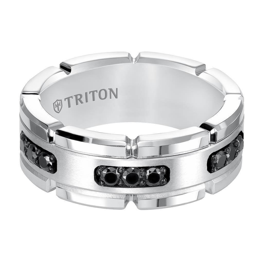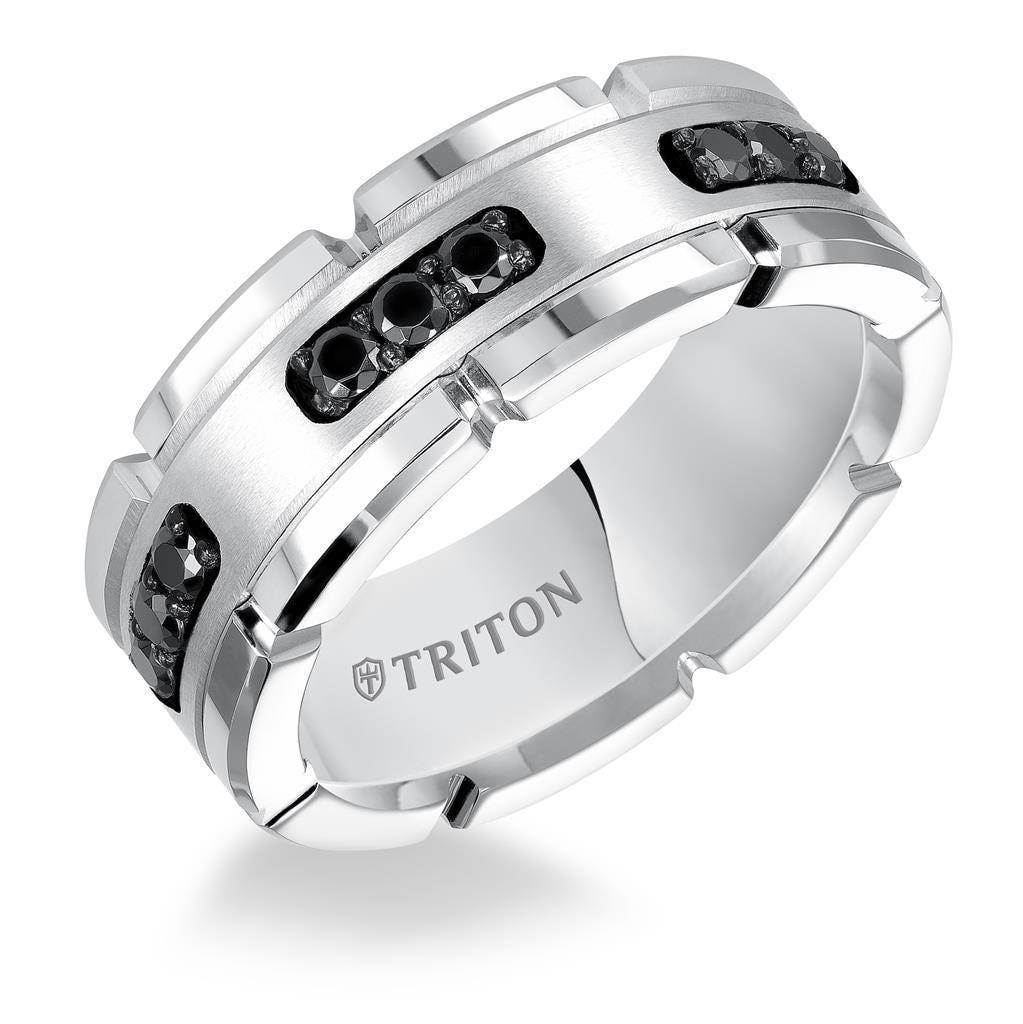 - This Triton ring has a marvelous silver inlay with stunning black diamonds on a contemporary style ring. The diamonds go half way around the ring in groups of three, for a total of 9 round cut black diamonds for a total carat weight of 0.27 ct. There are also polished notches going around the ring at both edges. This is the perfect wedding ring to represent your love and commitment. Larson Jewelers is proud to be an authorized dealer of Triton Rings. Triton Rings is one of the most well known and respected designers of tungsten rings in the USA. All their rings come with a manufacturer's warranty that covers size exchanges for life, and repair or replacement in case of accidental damage. Note: There is a fee charged by Triton Rings, not us, for all warranty work to cover shipping and handling.