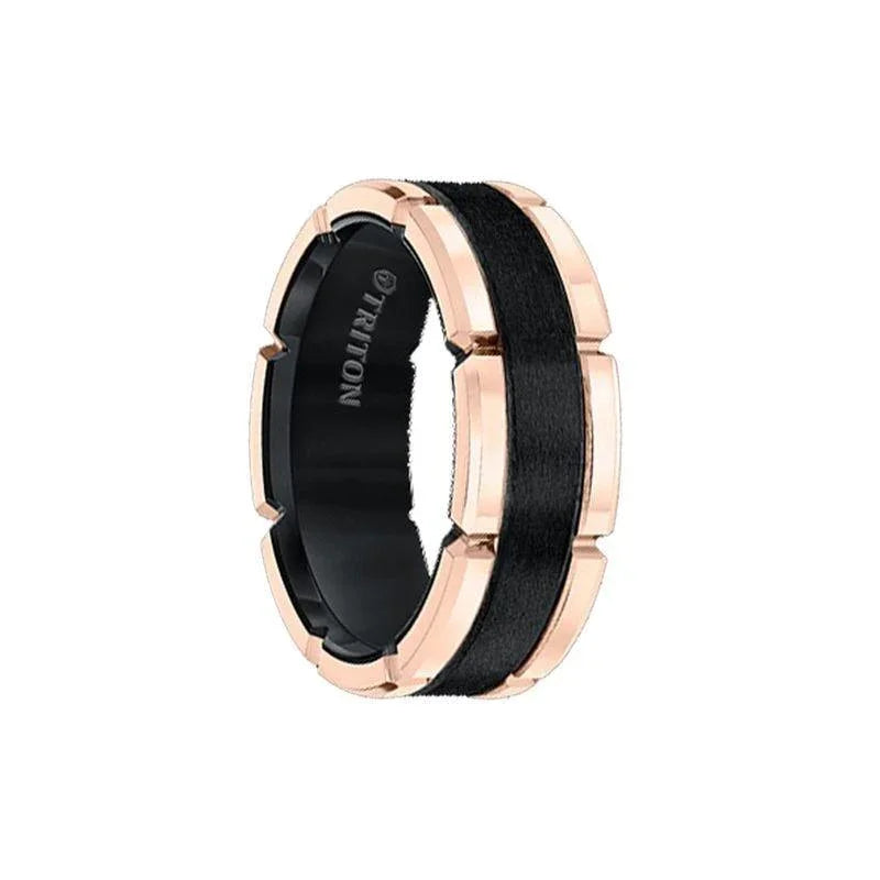 KEVIN Black Tungsten Flat Comfort Fit Band with Brushed Center & Rose Rims by Triton Rings - 8mm