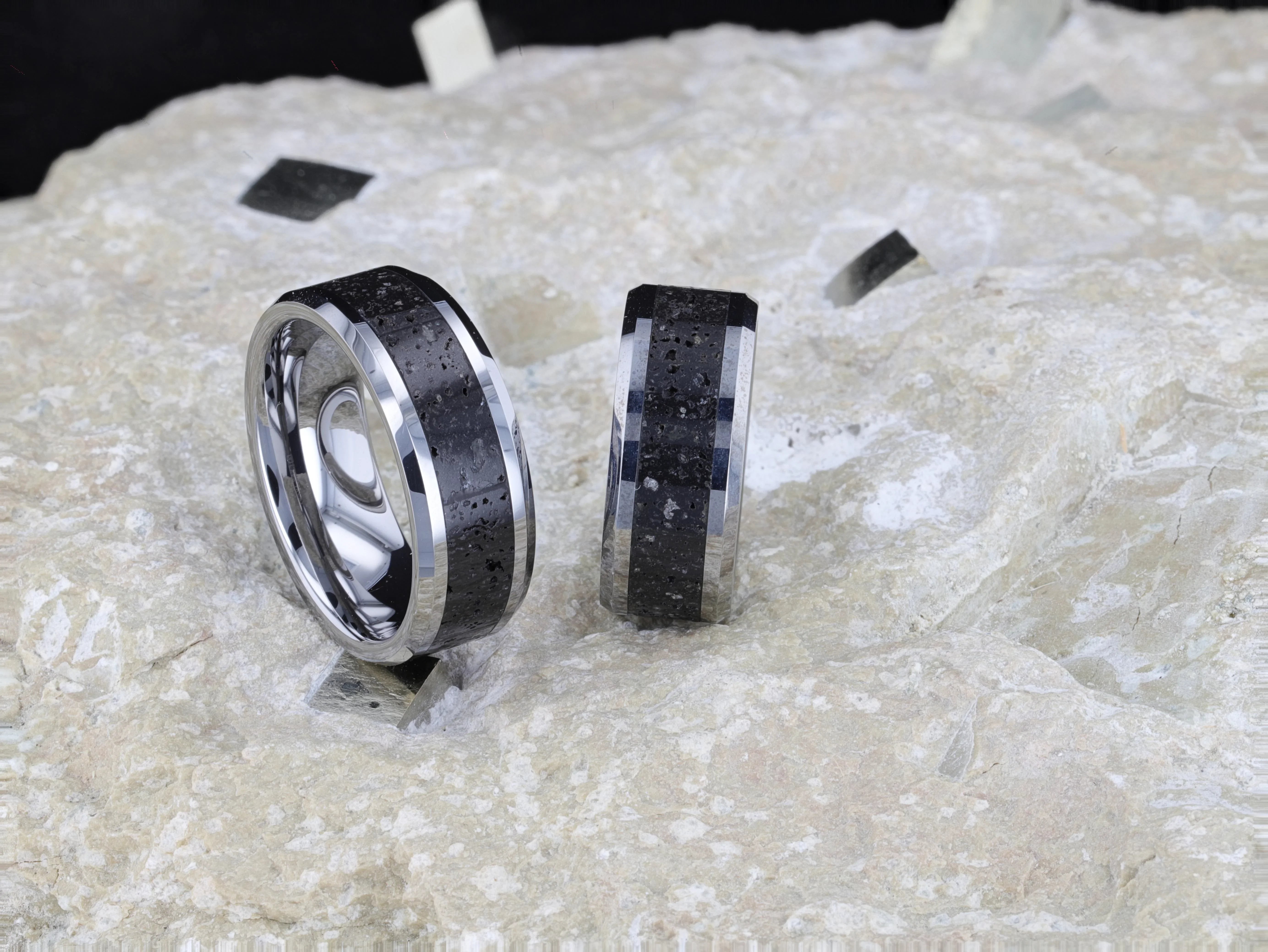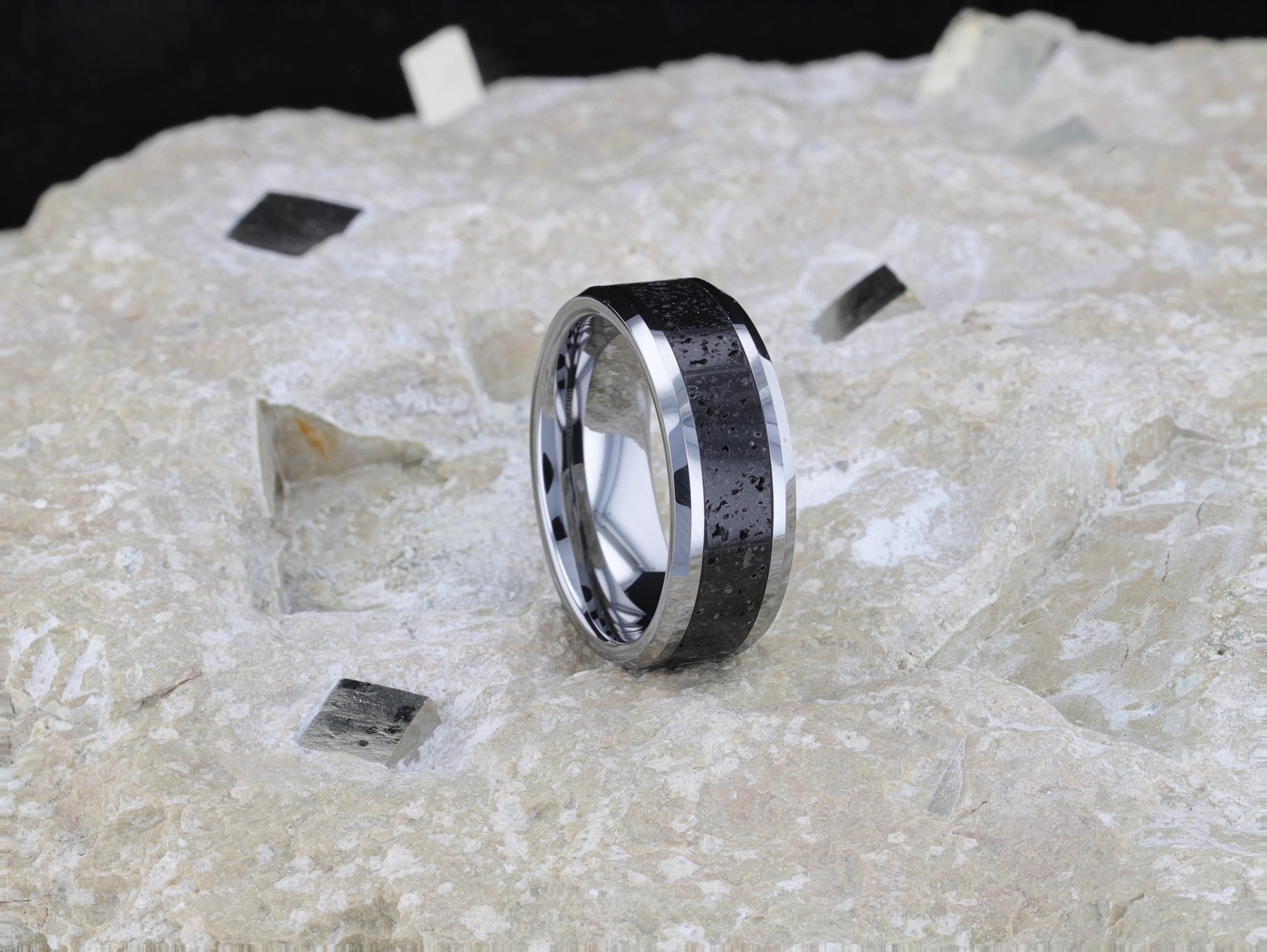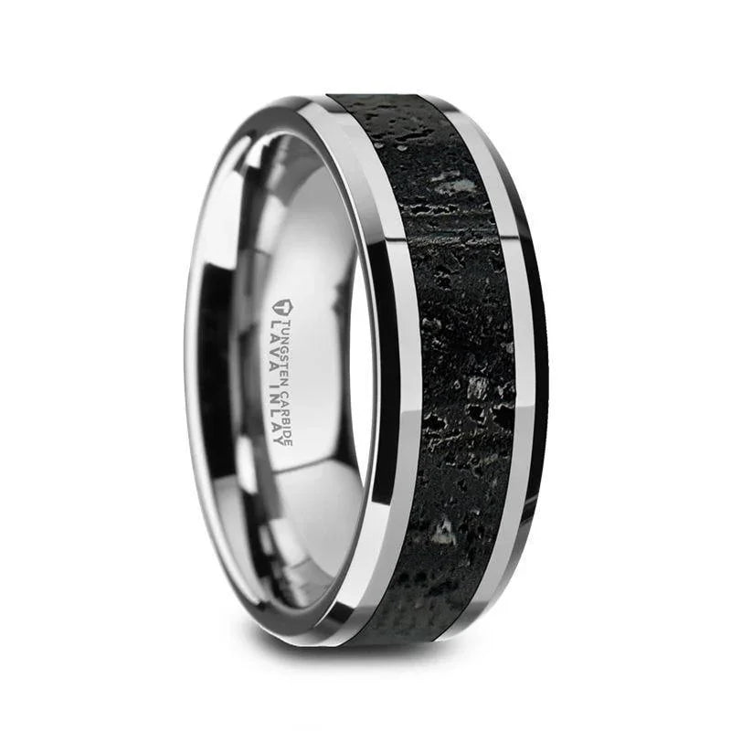 KILAUEA Men’s Polished Tungsten Wedding Band with Black & Gray Lava Rock Stone Inlay & Polished Beveled Edges - 8mm