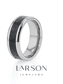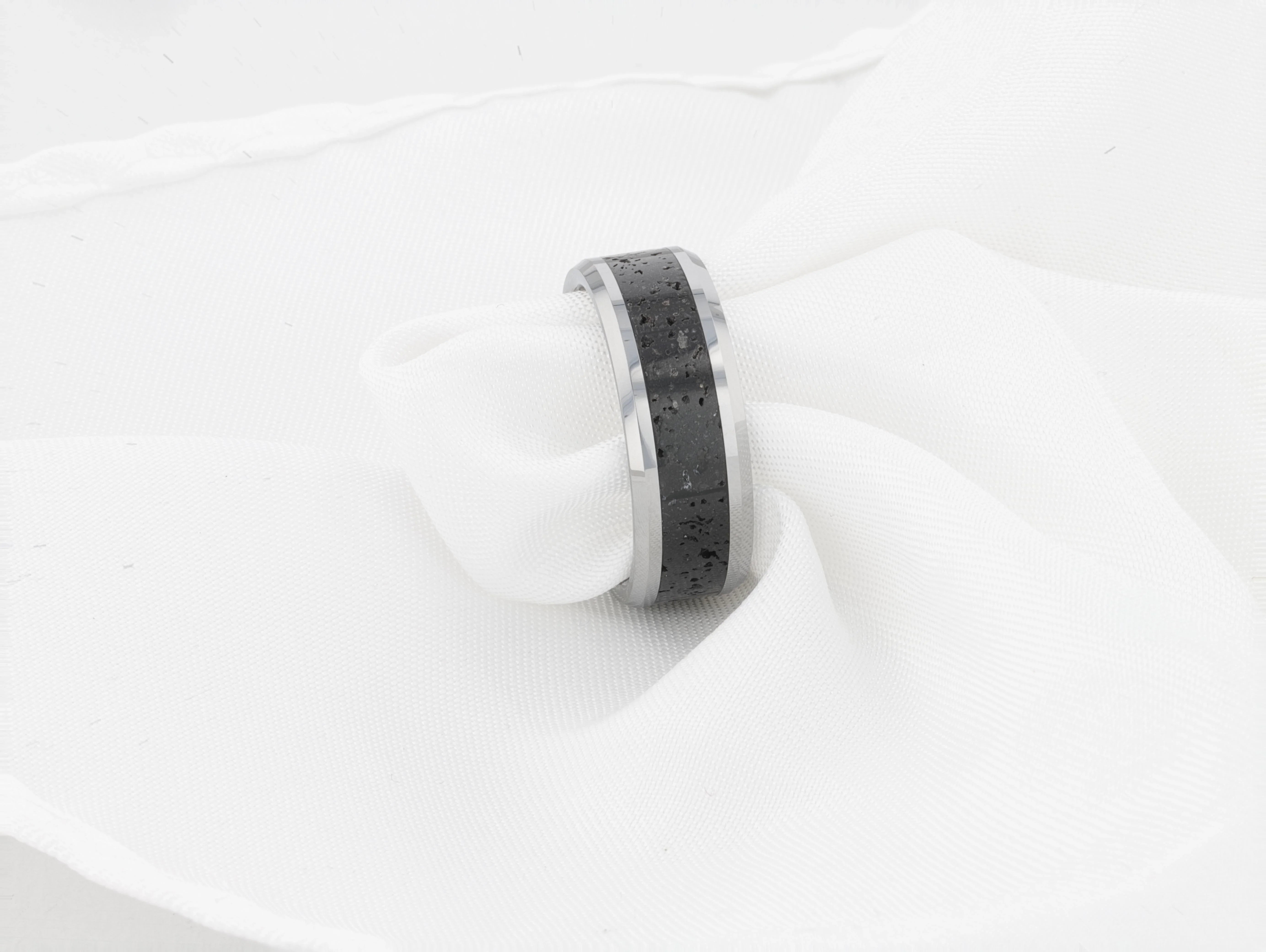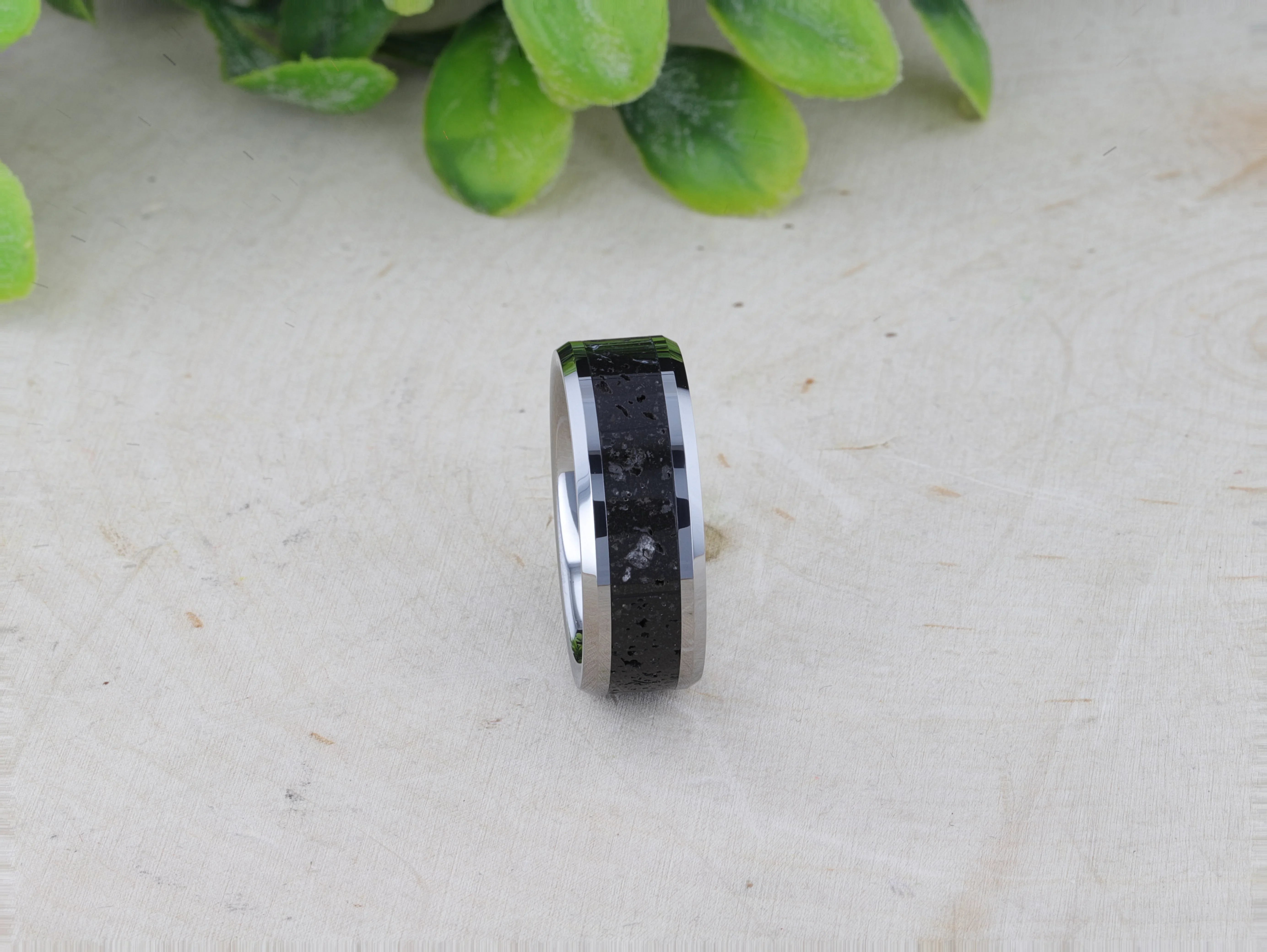 A volcano that now sits dormant on your finger. This stylish and handsome Tungsten wedding band has glossy, polished edges with bevels. It’s the inlay that takes center stage, however, with a mashup of black and gray Genuine Lava rock. It looks as if a channel of Genuine Lava once flowed through the band, only to harden, leaving it in its current state. The ring is available in 8mm width and several sizes.