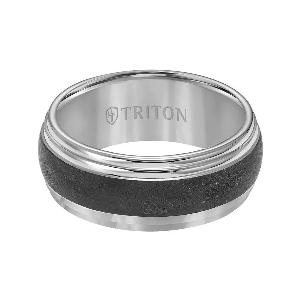 - This 9mm Triton black and white tungsten wedding band is made in a domed style with brightly polished white tungsten double step edges and a rich black Florentine finished center. This is the perfect wedding ring to represent your love and commitment. Larson Jewelers is proud to be an authorized dealer of Triton Rings. Triton Rings is one of the most well known and respected designers of tungsten rings in the USA. All their rings come with a manufacturer's warranty that covers size exchanges for life, and repair or replacement in case of accidental damage. Note: There is a fee charged by Triton Rings, not us, for all warranty work to cover shipping and handling.