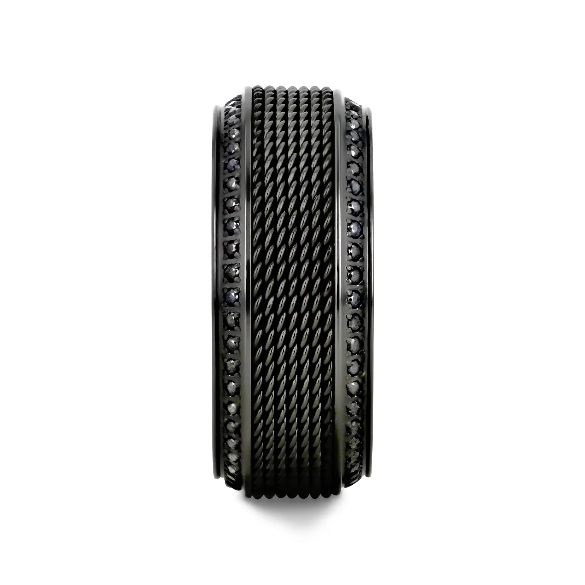 KNIGHT Steel Chain Black Titanium Wedding Ring Polished Beveled Edges Set with Round Black Diamonds - 10mm