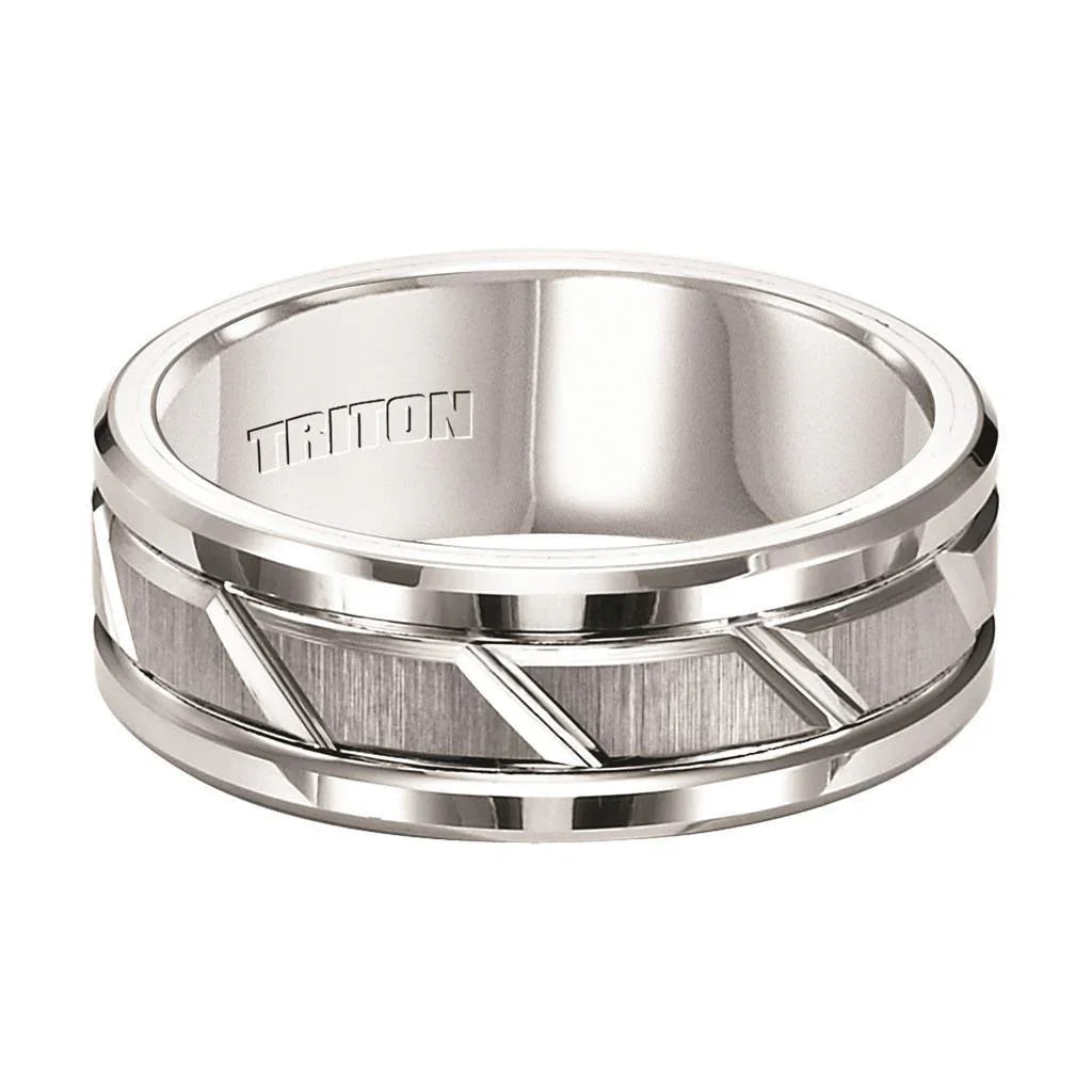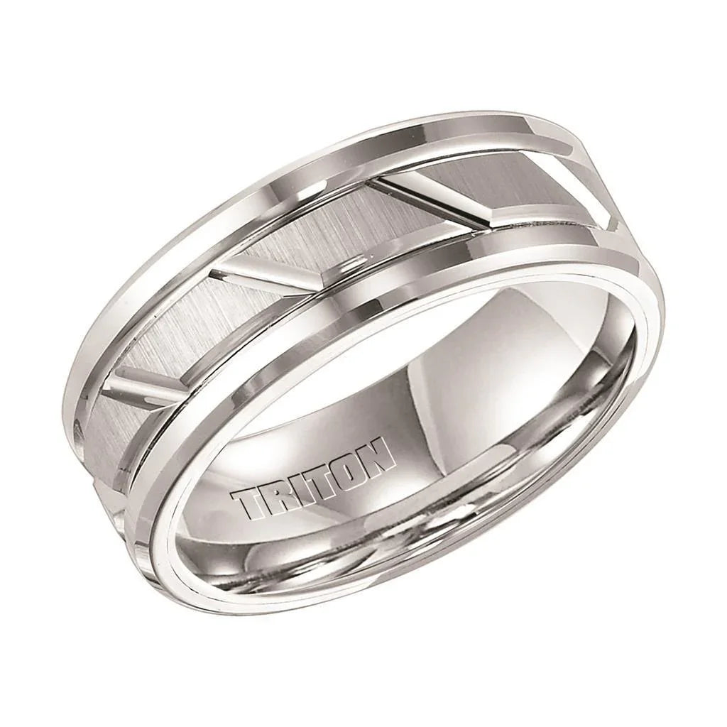Dual Grooved White Tungsten Carbide Wedding Band with Diagonal Cut Brush Finished Center and Polished Beveled Edges by Triton Rings - 8 mm