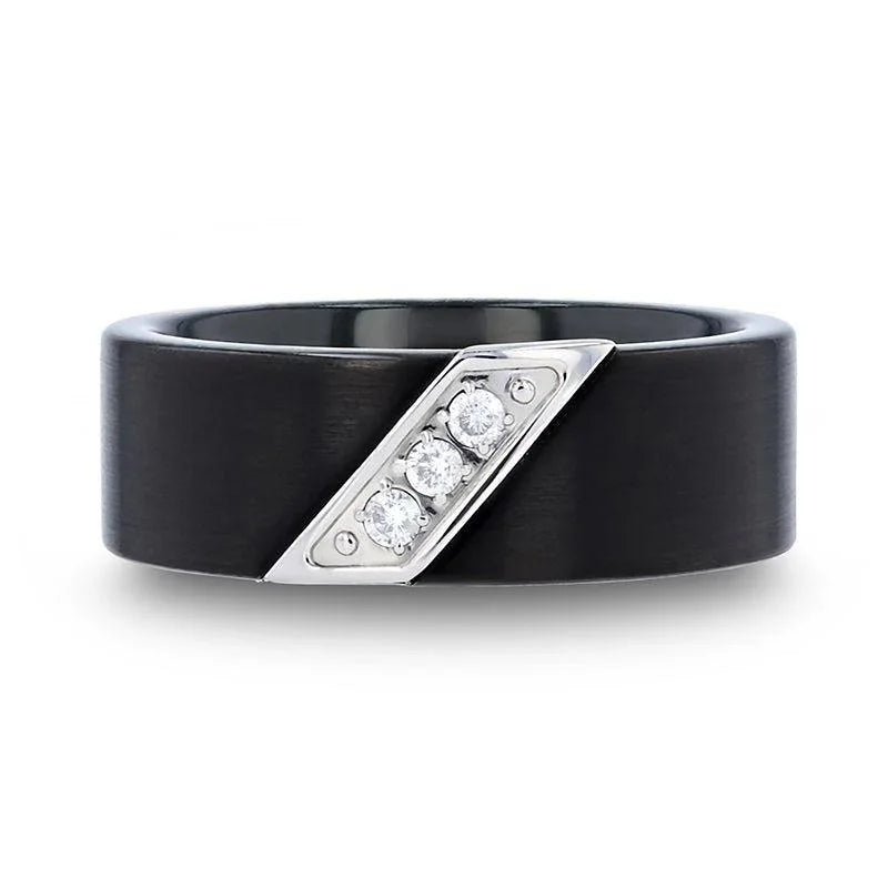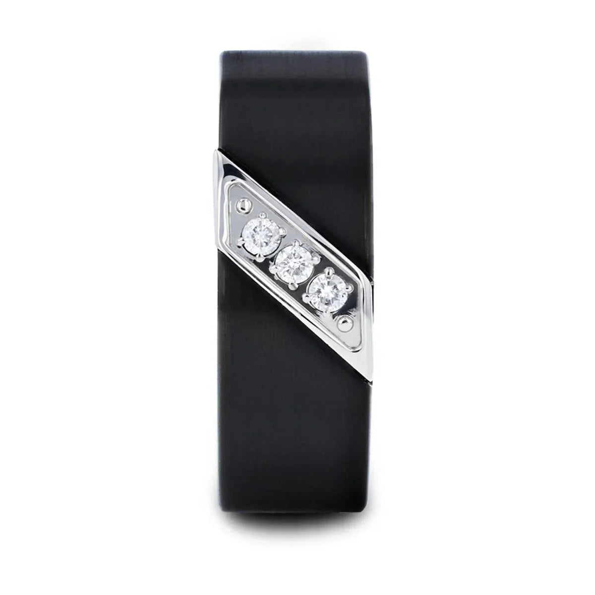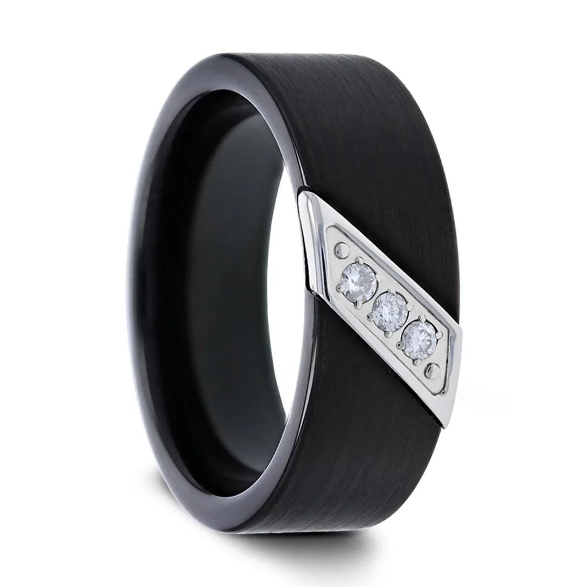This is a black tungsten carbide wedding band that is simply a classic and timeless style that will never become dull. This black tungsten ring is created with three white diamonds with a total weight of 0.12 carats set diagonally across the width of the ring. The 3 slanted white diamonds combines perfectly in a slanted steel frame in the black tungsten ring.