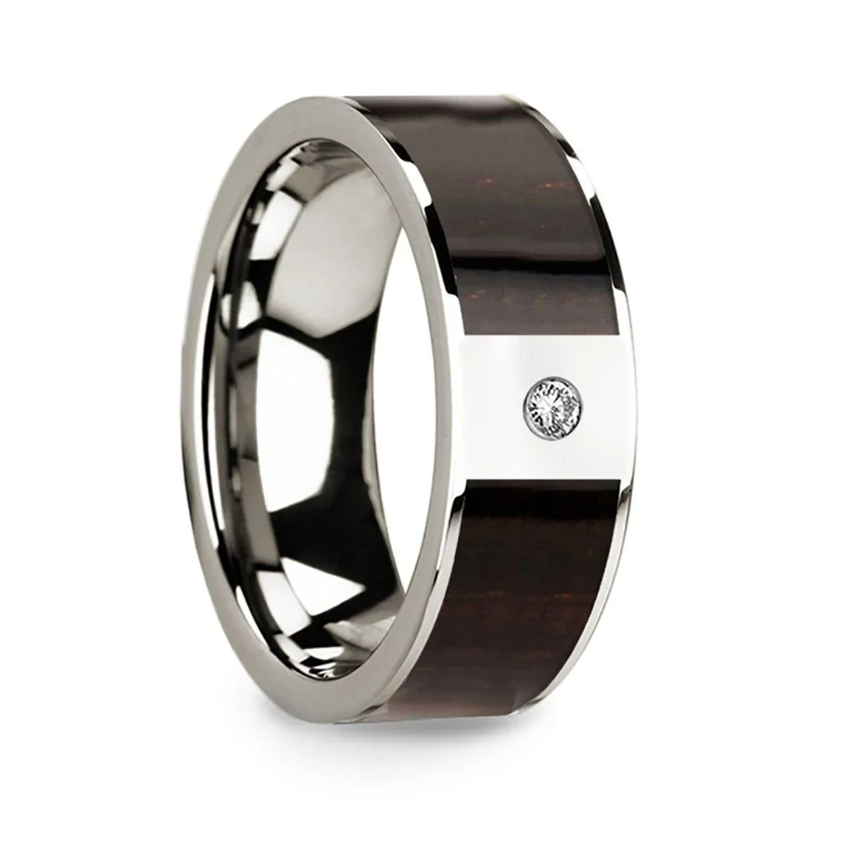 Men’s Polished 14k White Gold & Ebony Wood Inlaid Wedding Ring with Diamond Center - 8mm