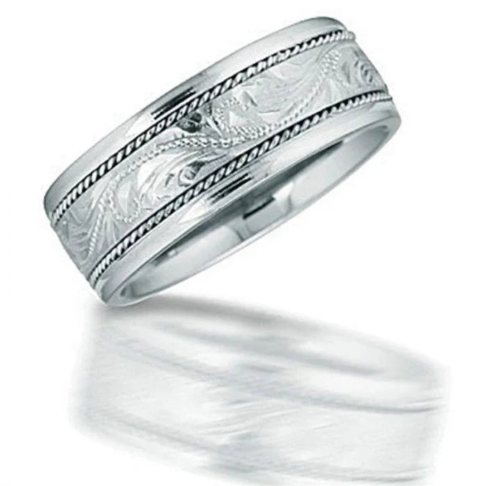 MOLOKAI Novell Hand Engraved Hawaiian Patterned Center Silver Wedding Band - 8mm