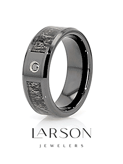 Here we have a black ceramic wedding band with an ombre deer antler inlay, featuring a beautifully polished finish and 0.05 carat black diamond. Its subtle deer antler inlay design decorates the center of the band perfectly, highlighting its clear tones of white, brown, and tan. This masculine wedding band is perfect for outdoors enthusiasts as well as hunters!