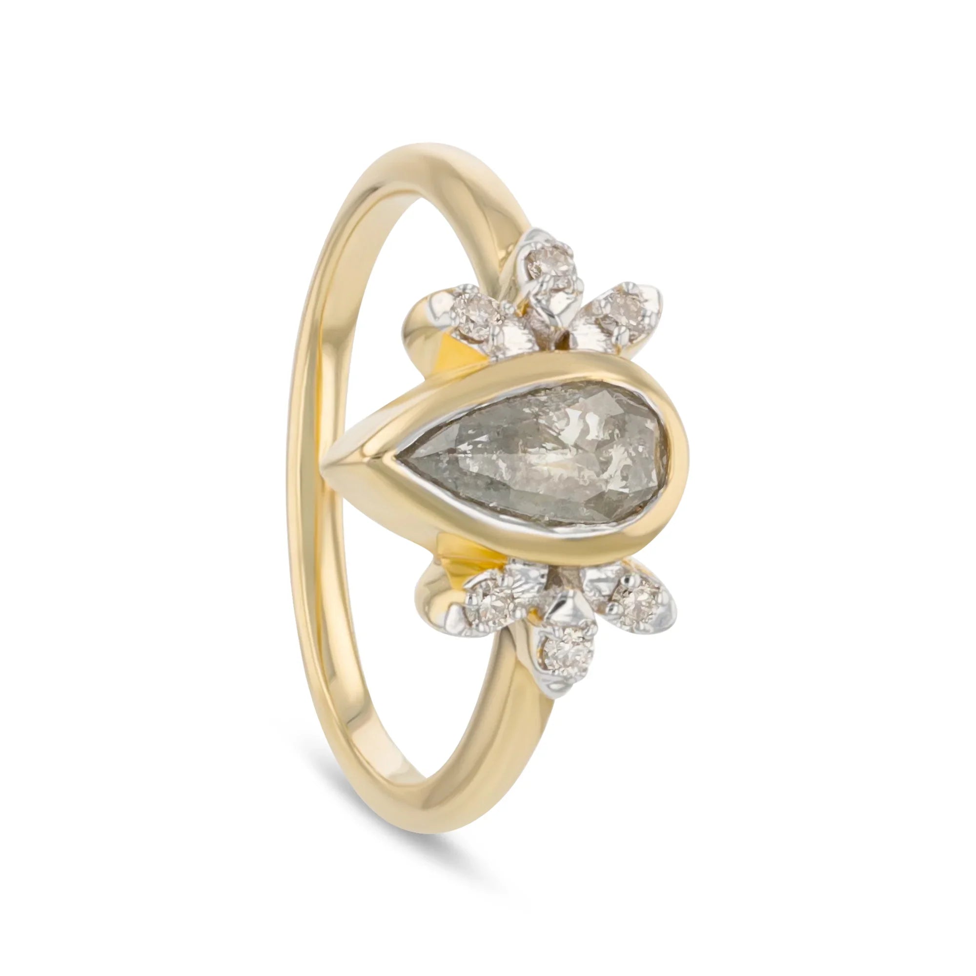 Surrounding the 0.78 ct pear diamond are six dazzling diamonds, each meticulously selected to enhance the brilliance and allure of the center stone. Set against the warm glow of yellow gold, these diamonds add a touch of sophistication and radiance to the ring, ensuring it sparkles as brightly as your future together.