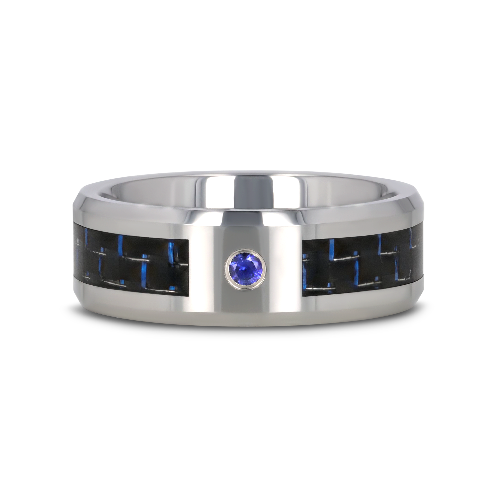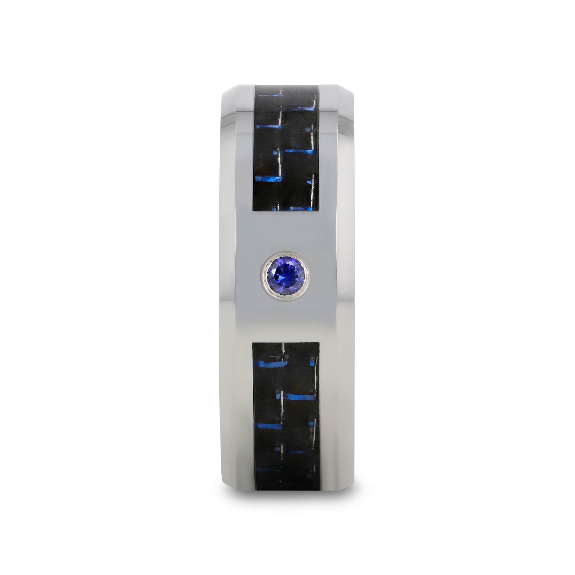 NEPTUNE Tungsten Carbide Ring with Black and Blue Carbon Fiber and Blue Sapphire Setting with Bevels - 8mm