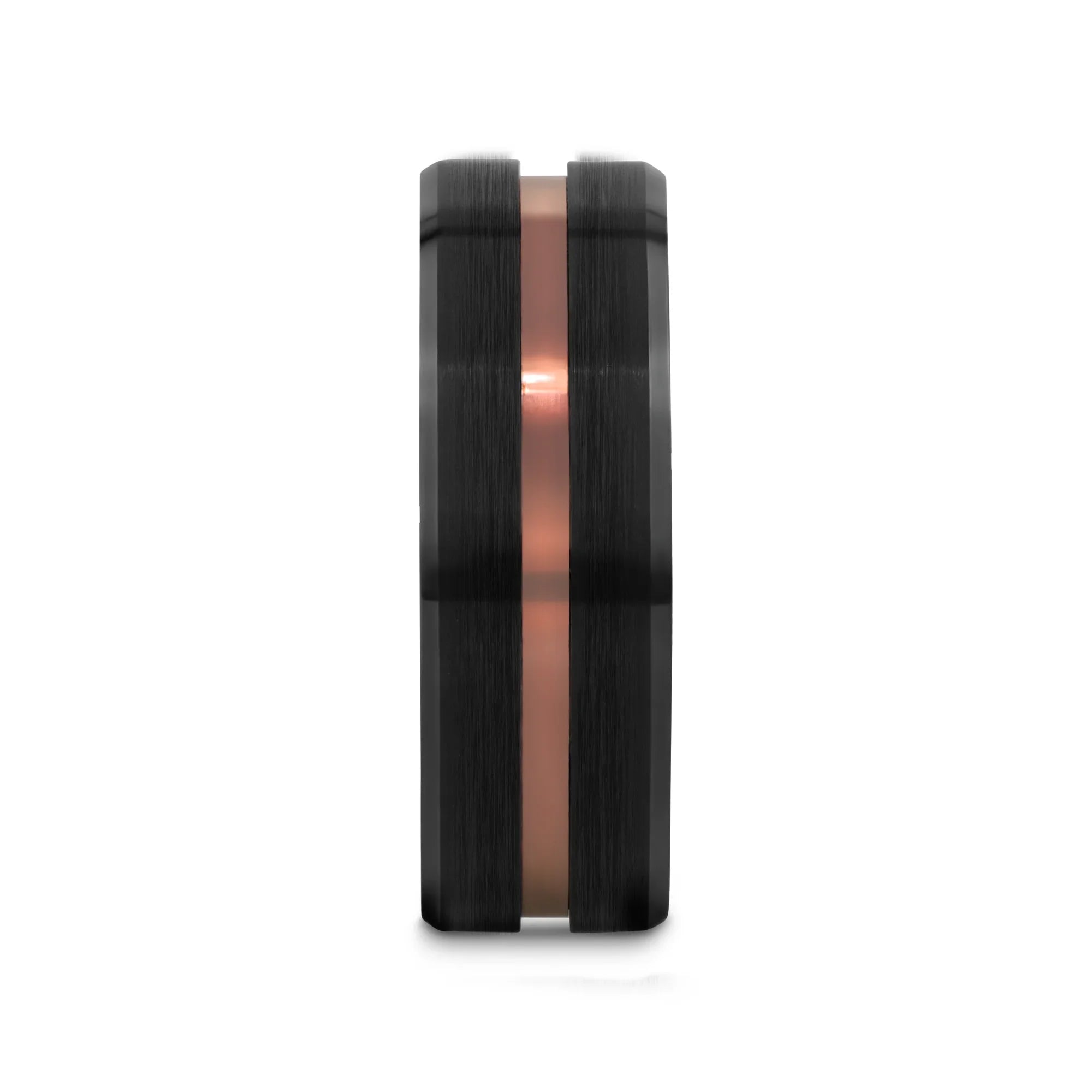 Crafted with expert precision, the NEVAN Flat Brushed Black Tungsten Men's Wedding Band features a sleek espresso groove center for a modern touch. Made of black tungsten, it offers exceptional durability and a lightweight feel. Perfect for stylish grooms who value quality and sophistication. Available in an 8mm width.