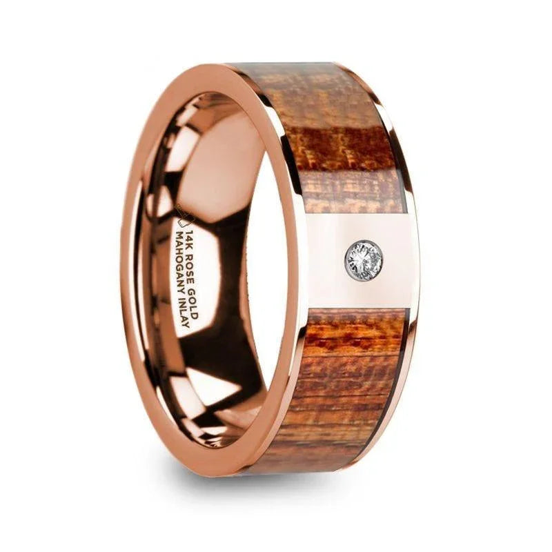 NIKIAS Men’s Polished 14k Rose Gold Wedding Band with Mahogany Wood Inlay & Diamond - 8mm