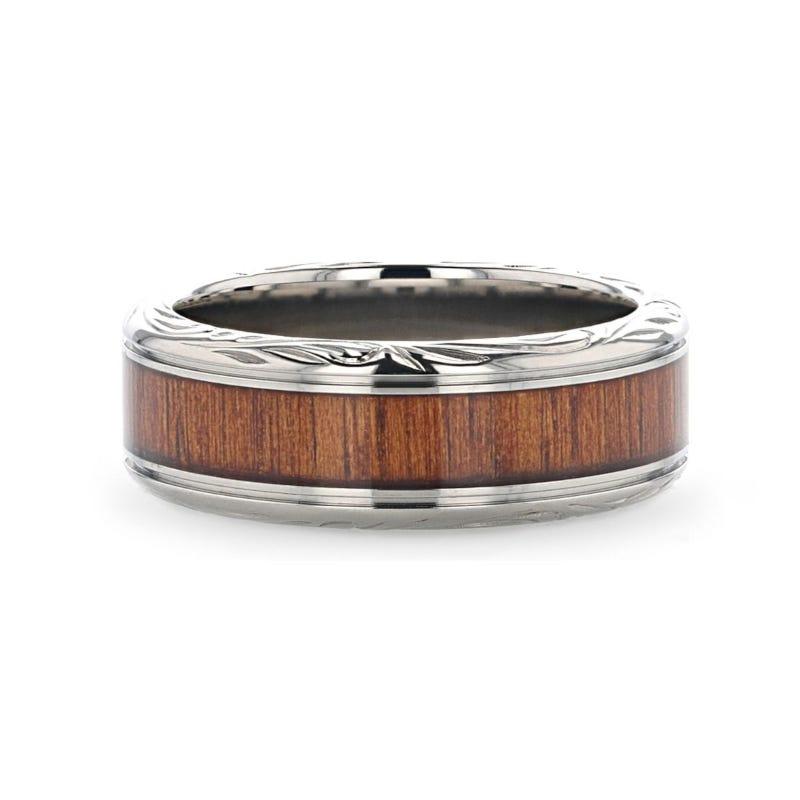 OHANA Koa Wood Inlaid Titanium Men’s Wedding Ring with Intricate Edges - 6mm - 10mm