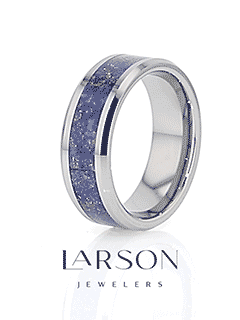 Inlaid with sparkling and striking Genuine Blue Lapis Lazuli, one of the most desired stones in the world and a symbol of protection, honor, wisdom and truth is this amazing Tungsten Carbide men’s wedding band by Thorsten.