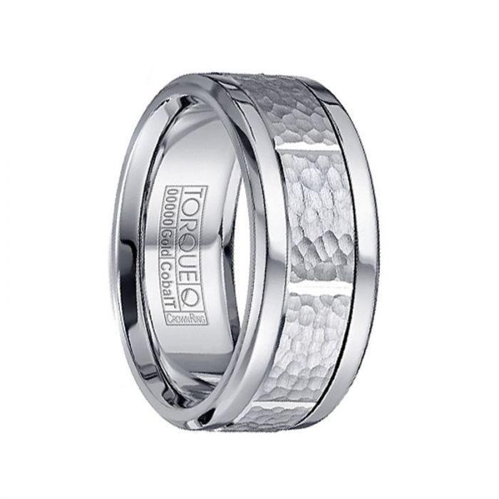 Feel special on your big day with this polished white cobalt band by Crown Ring. Sleek polished grooves interrupt the edgy hammered 14k white gold center, forming a unique combination. It features dual grooves down both sides and has a rounded comfort fit interior. This ring is available in a 9mm width. You can also find similar ring styles in our hammered and sandblasted collection. This ring is covered by a lifetime Crown Ring warranty that covers scratching, breakage and manufacturing defects.