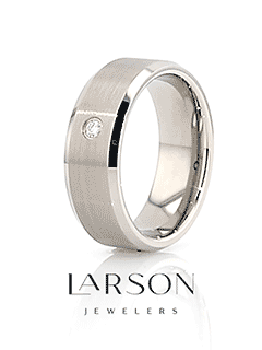 This extremely desired tungsten carbide wedding ring is one of the most sought after designs in men's wedding bands. Created with a detailed brushed finish and high polish beveled edges, the single white diamond shows beautifully against the brushed finish.