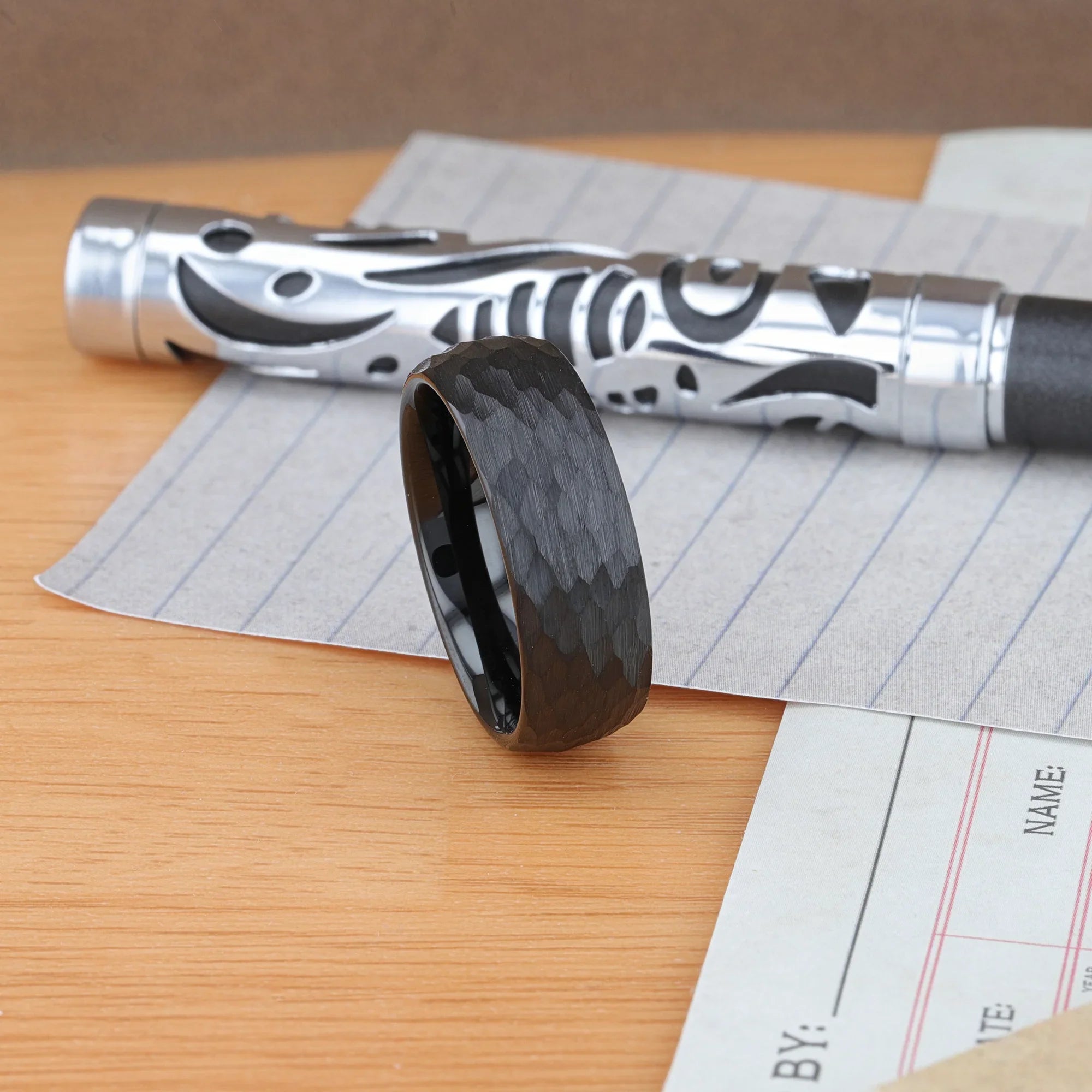 RENEGADE Domed Hammered Black Tungsten Carbide Wedding Band, Brushed Finish β 6mm or 8mm
