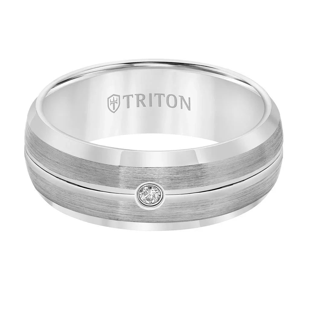 - This beautifully crafted 8mm white tungsten Triton ring features a satin finish center with a distinctive bright center groove and polished bevels. The luxurious design is a perfect setting for a beautiful round cut white diamond. The diamond is 0.05 ct, I2 clarity, I or J color. This is a stunning wedding band to symbolize your love and commitment. Larson Jewelers is proud to be an authorized dealer of Triton Rings. Triton Rings is one of the most well known and respected designers of tungsten rings in the USA. All their rings come with a manufacturer's warranty that covers size exchanges for life, and repair or replacement in case of accidental damage. Note: There is a fee charged by Triton Rings, not us, for all warranty work to cover shipping and handling.