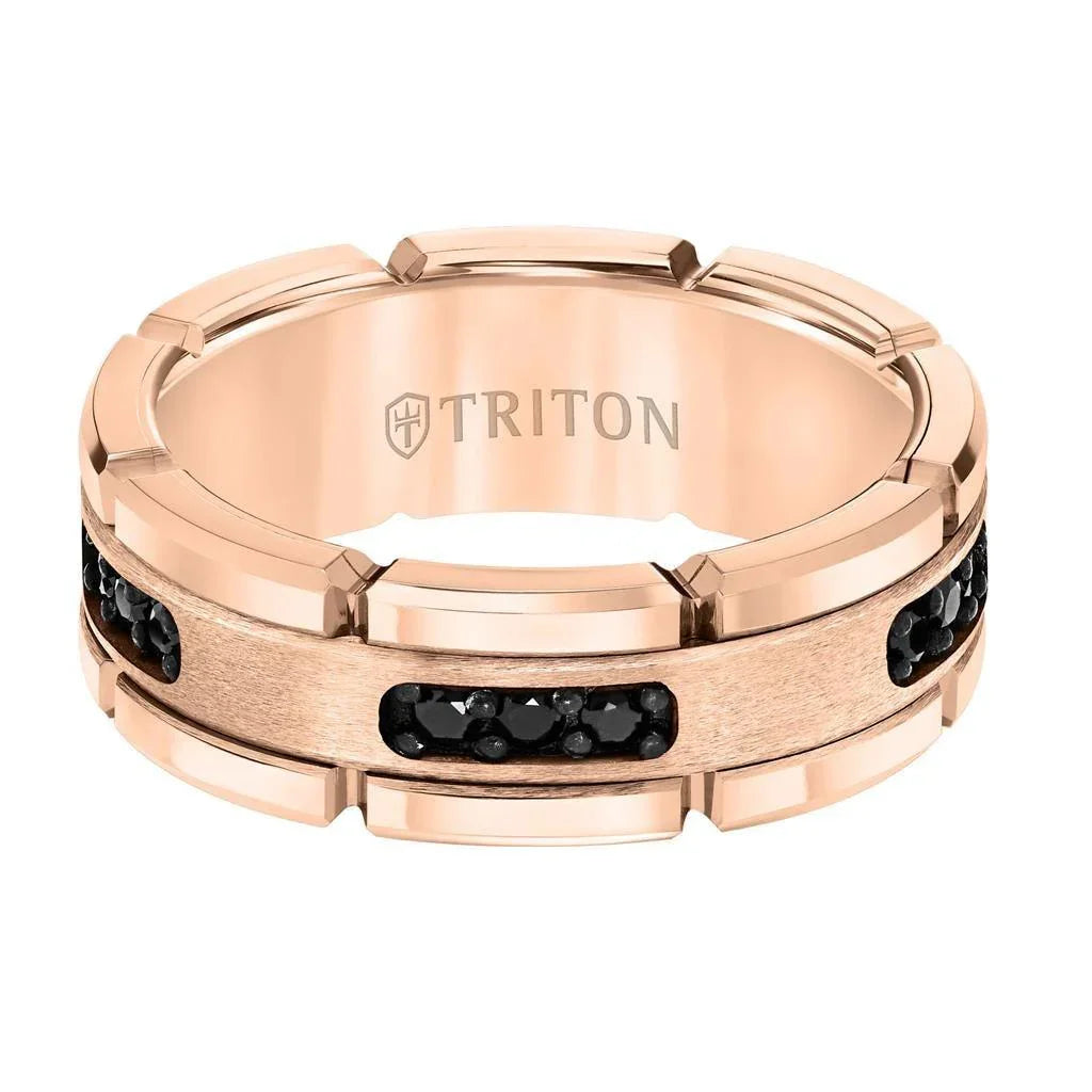 ROSETTE Flat Rose Gold Plated Tungsten Ring with Black Diamond Settings by Triton Rings - 8mm
