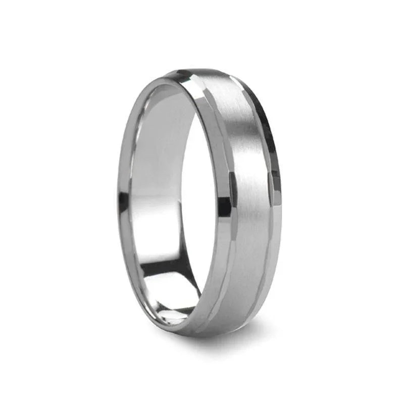 - This modern style from our argentium silver rings line by Novell Design Studio is made from Argentium Silver, a precious metal that is whiter than white gold. Argentium Silver is at least 92.5% pure silver alloyed with Germanium, so it does not tarnish like normal silver jewelry. This style has sloping polished edges, a raised brush finish center, and dual offset groves with carved facets. This ring can be worn as a Wedding Band or Promise Ring and is available in 5 mm, 6 mm, 7 mm and 8 mm wide for couples who wish to have a matching set. Larson Jewelers is proud to present Novell's silver wedding bands line, which is the ideal metal for couples who what their wedding rings to be whiter than platinum, made of precious metal, and non-tarnishing.