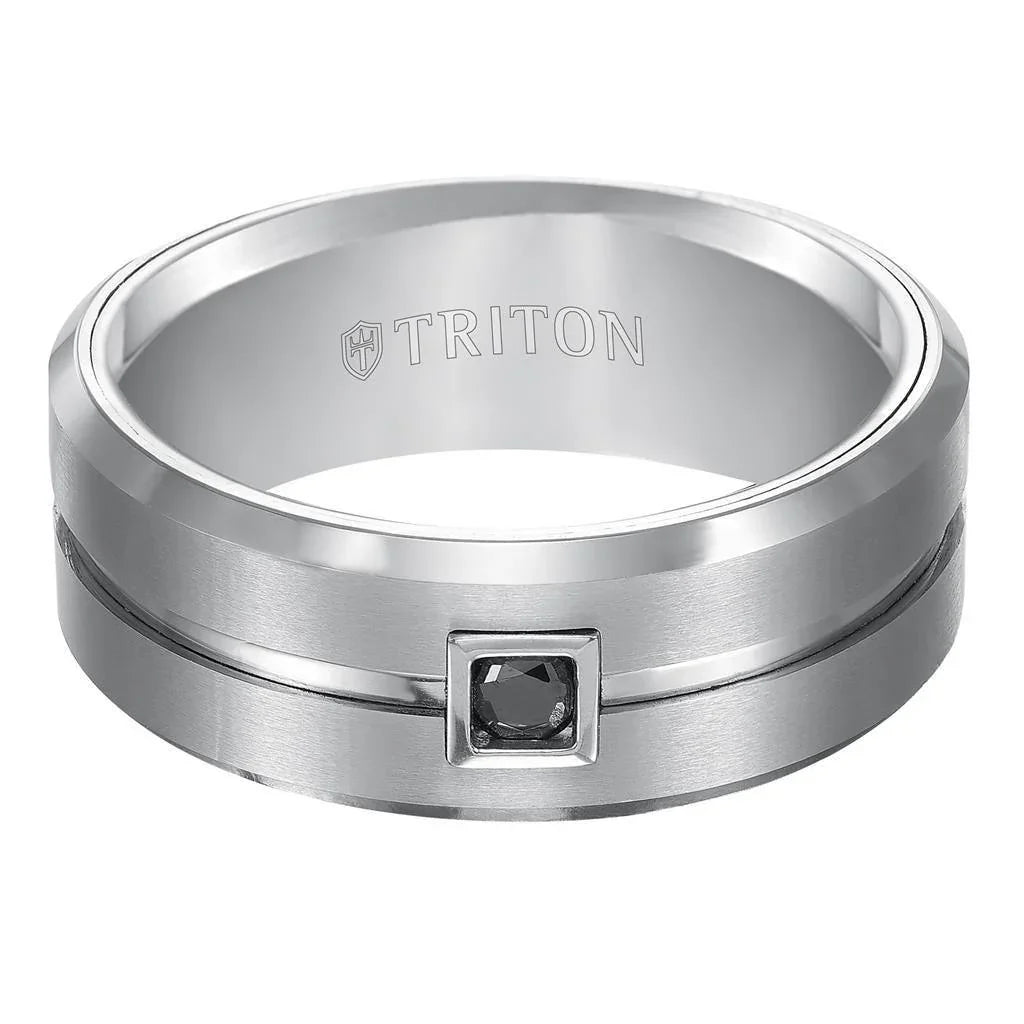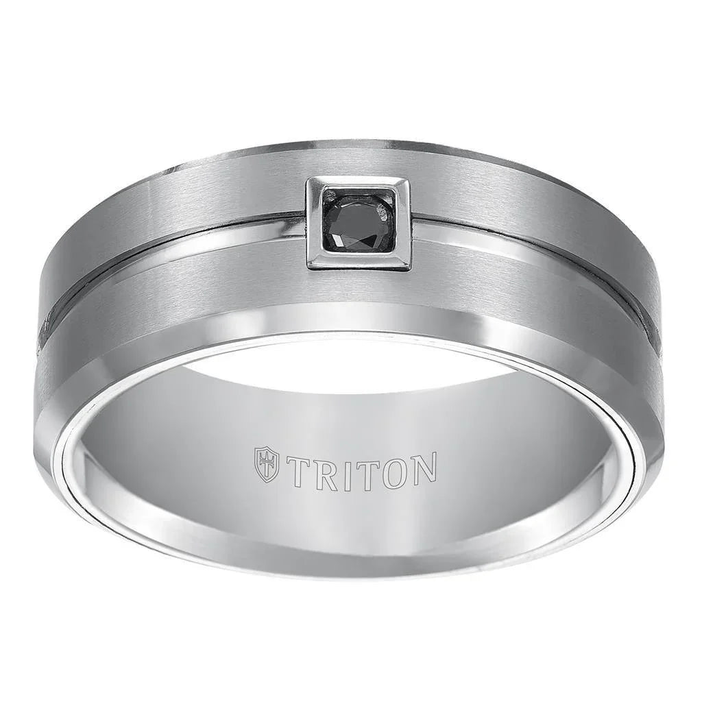 - This Triton white tungsten wedding band is made in a horizontal brushed finish style with a brightly polished recessed center groove and beveled edges in a 9 mm width. This elegant backdrop stunningly features a round black solitaire diamond set in a square bezel for an uber chic look. The diamond is 0.1 ct, I2 clarity, I or J color. This is the perfect wedding ring to represent your love and commitment. Larson Jewelers is proud to be an authorized dealer of Triton Rings. Triton Rings is one of the most well known and respected designers of tungsten rings in the USA. All their rings come with a manufacturer's warranty that covers size exchanges for life, and repair or replacement in case of accidental damage. Note: There is a fee charged by Triton Rings, not us, for all warranty work to cover shipping and handling.
