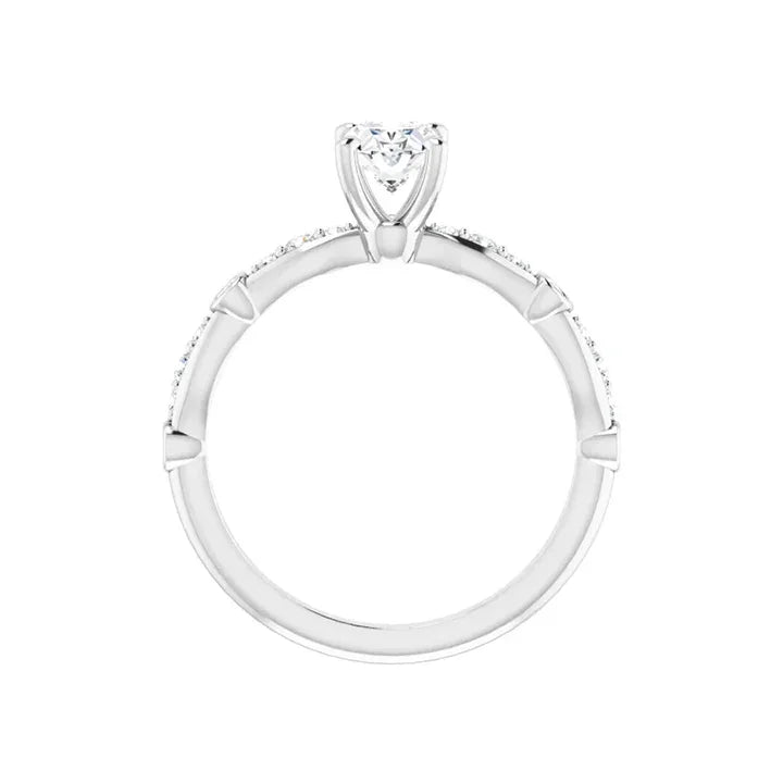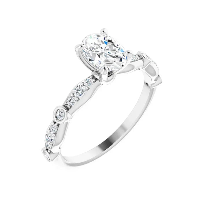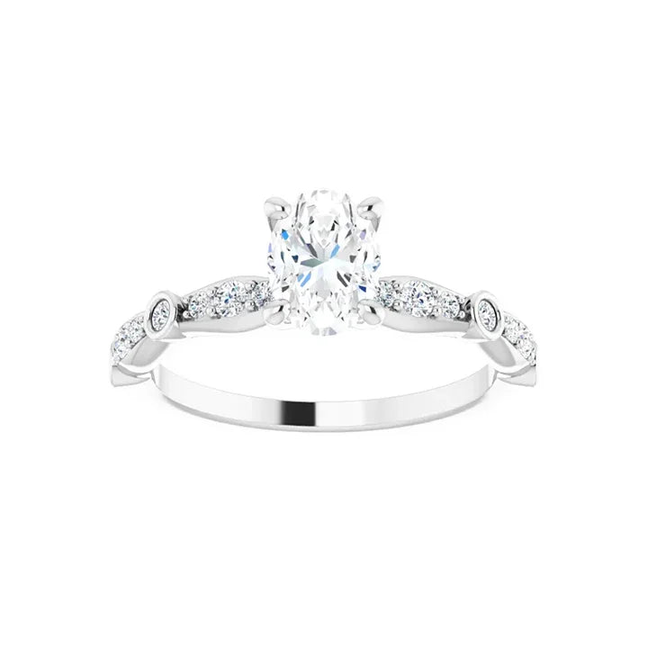 This platinum oval engagement ring features a polished finish and a brilliant lab grown diamond. Add a touch of elegance to any style with this silver-colored ring from expert manufacturer Stuller. Enjoy the benefits of a durable and sustainable lab grown diamond, making this ring a timeless and responsible choice. The center diamond is certified for authenticity by a third-party grading laboratory and is engraved with the certificate number.