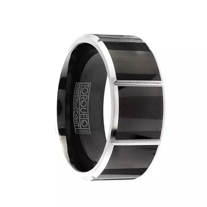 SONIC Torque Black Cobalt Wedding Band Polished Finish Vertical Line Grooved Accents Beveled Edges - 9 mm