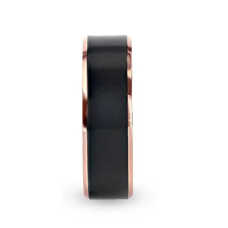 STEPHEN Rose Gold Plated Black Titanium Flat Brushed Center Men's Wedding Ring With Beveled Polished Edges - 6mm & 8mm