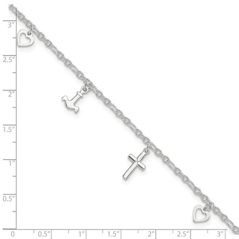 Sterling Silver Cross Heart and Anchor 10in Plus 1in ext Anklet