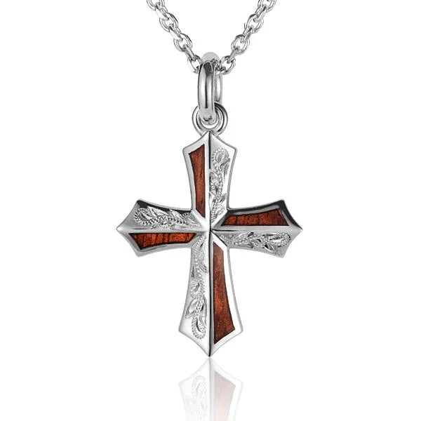 Sterling Silver Koa Wood Engraved Cross Pendant 18" Necklace