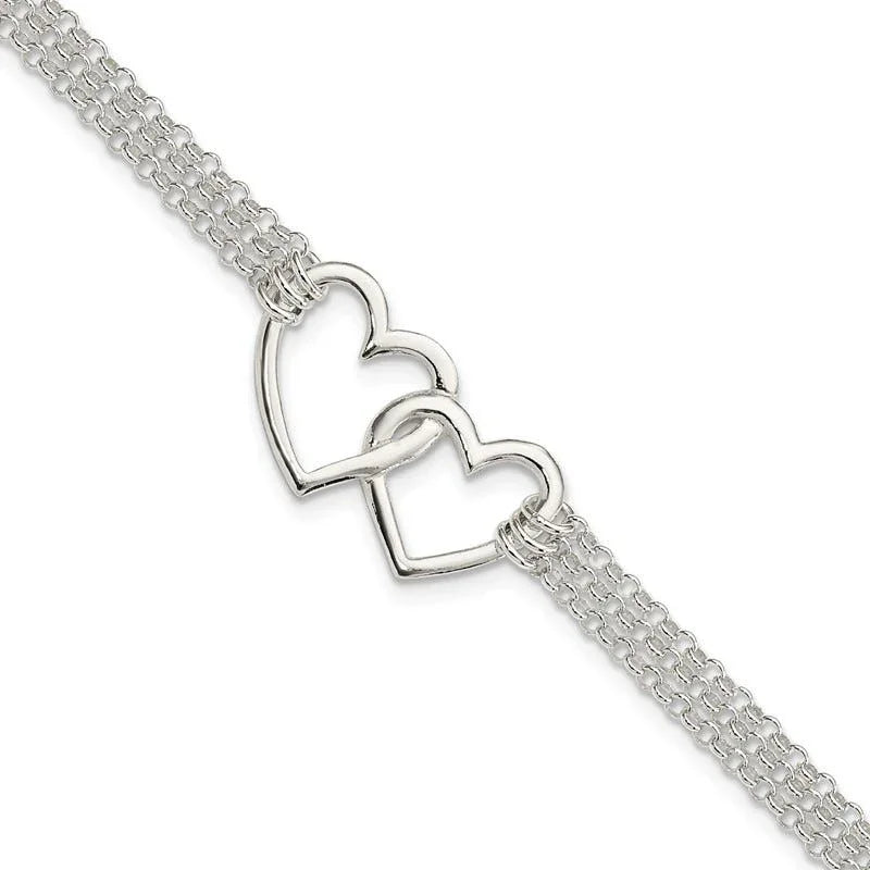 Sterling Silver Polished 3-strand w/.5in. Ext. Heart Bracelet
