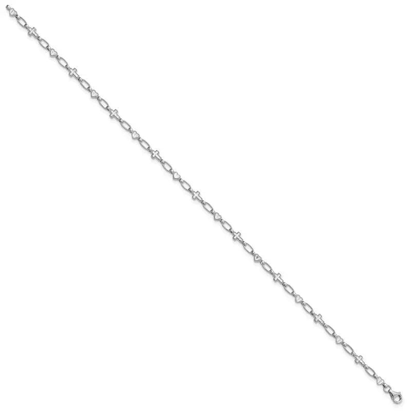 Sterling Silver Rhodium-plated 10 inch Heart and Cross Anklet