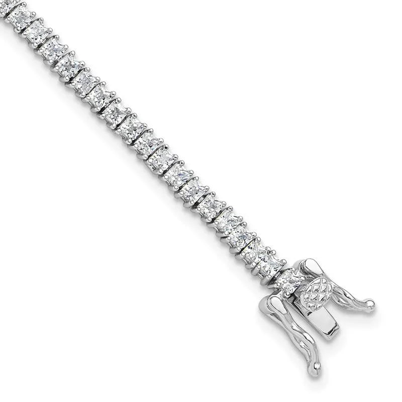 This Sterling Silver Rhodium-plated tennis bracelet features 3mm Princess Cut CZ stones, creating a classic and elegant look. The rhodium plating adds durability and shine to the bracelet. Suitable for any occasion, this 7.75 inch bracelet is the perfect addition to any jewelry collection.