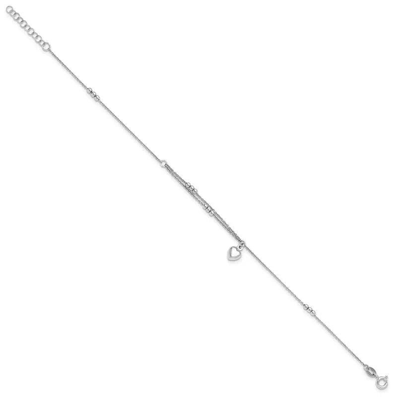 Sterling Silver Rhodium-plated Beads and Heart 9in Plus 1in ext Anklet