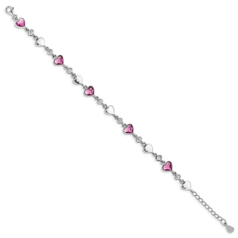 Sterling Silver Rhodium Plated Clear Crystals Pink Heart Crystals and Polished Hearts 6.5 inch Bracelet with 1 inch extension