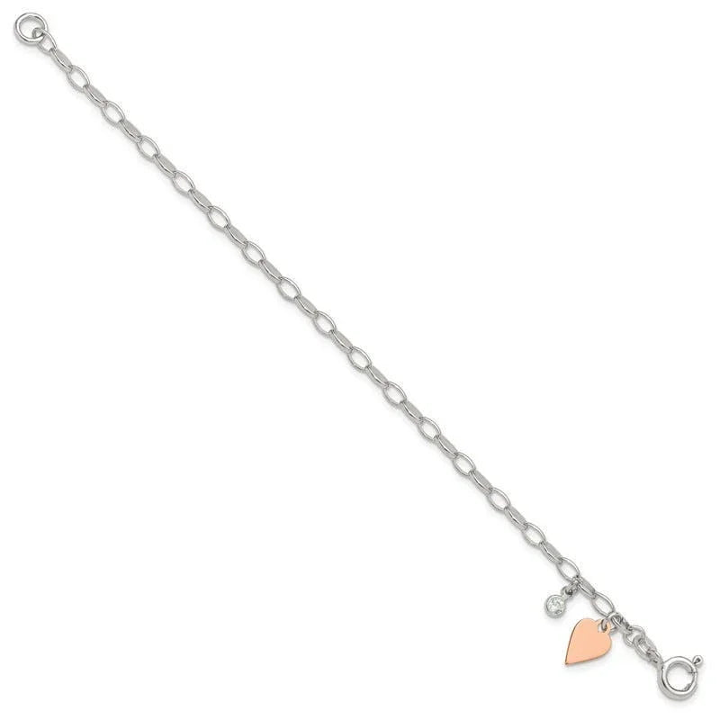 Sterling Silver Rose Gold-plated Polished w/Heart and CZ Link Bracelet