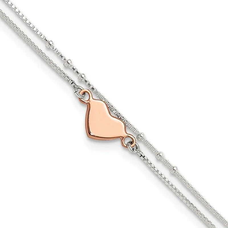 Sterling Silver Rose Tone 2-Strand Heart 9in Plus 1in ext. Anklet