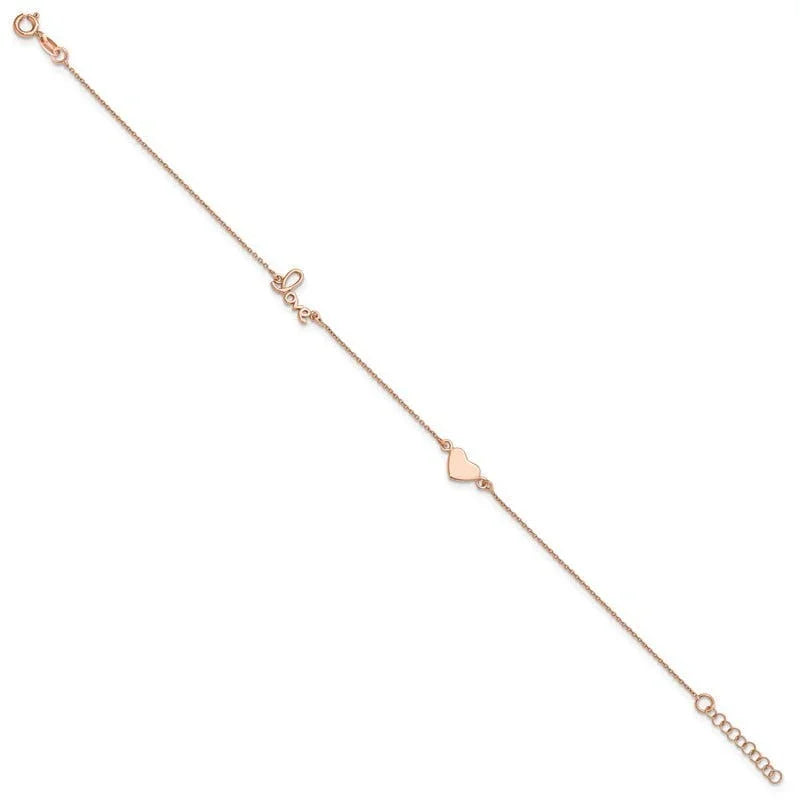 Sterling Silver Rose Tone Love and Heart 9in Plus 1in ext Anklet
