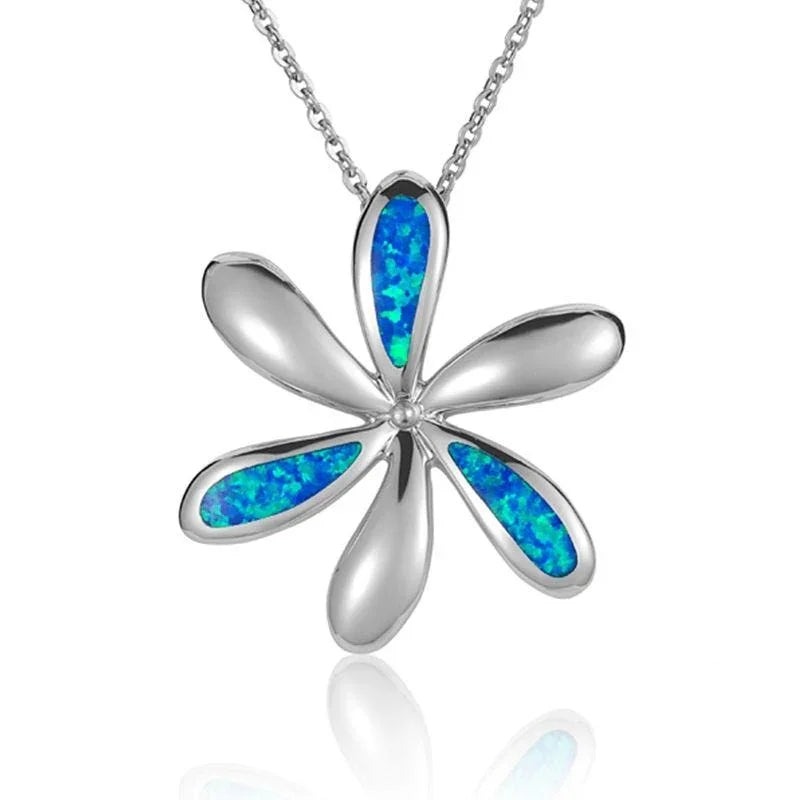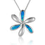 Here we have a flower Pendantwith a few petals replaced with a sparkling blue opal inlay. Coupled with an 18" chain, this necklace is completed with a polished finish. This necklace also makes for a great gift.