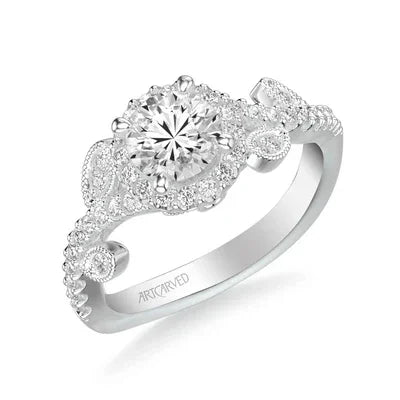 This Thalia Contemporary Round Halo Floral Diamond Engagement Ring offers a polished finish and a stunning floral diamond halo design. Crafted in platinum for timeless elegance and durability. Elevate your look with this Artcarved creation.