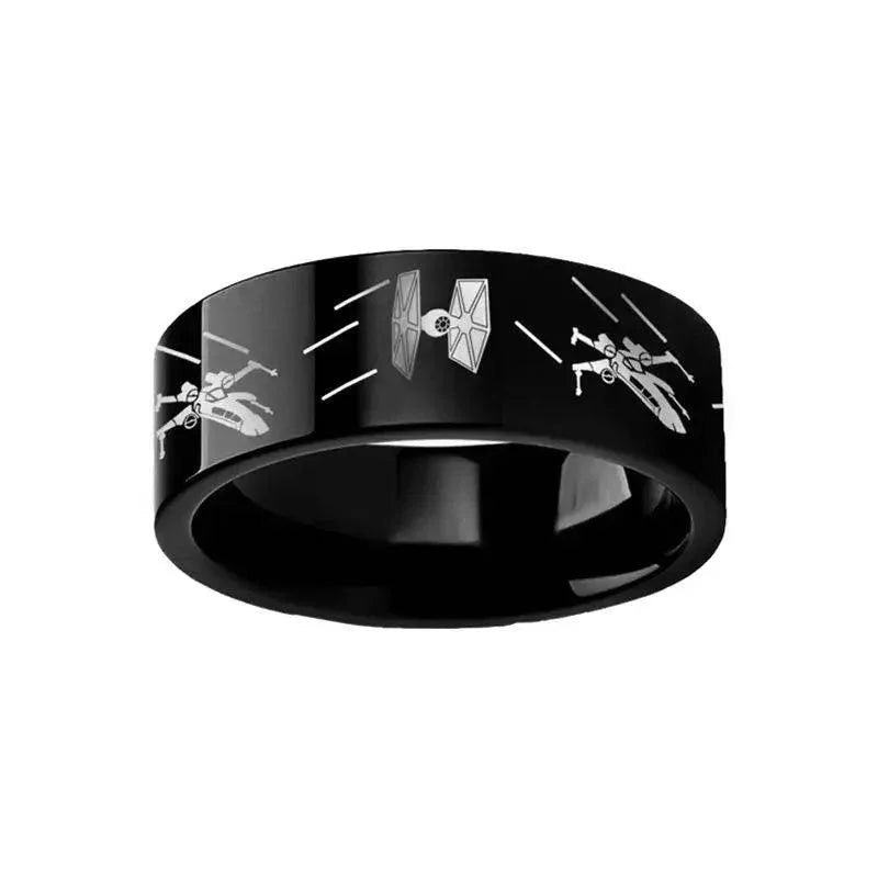 Tie Fighter X-Wing Design Black Tungsten Engraved Ring - 4mm - 12mm