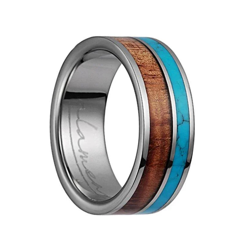 "Titanium Wedding Band With Pink Ivory Wood/Natural Turquoise Inlay and Polished Edges - 8mm With exotic pink ivory inlay and Natural Turquoise stone inlay side by side, this lightweight titanium wedding band is sure to impress. Pink ivory wood and Natural Turquoise stone is inlaid next two each other in two rows and are divided by a titanium center divider. This classic titanium wedding band is flat in design and comes in an 8mm width. This is the perfect wedding band to represent your love and commitment. Note, inlay is protected by a resin that can be scratched. Re-sizing and Warranty on all Thorsten alternative metal rings, no exchange|sizing fees.