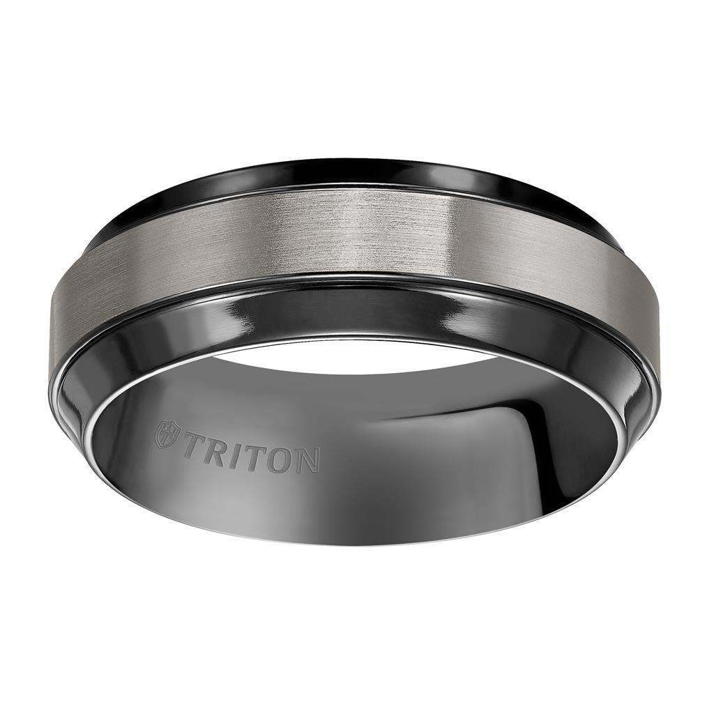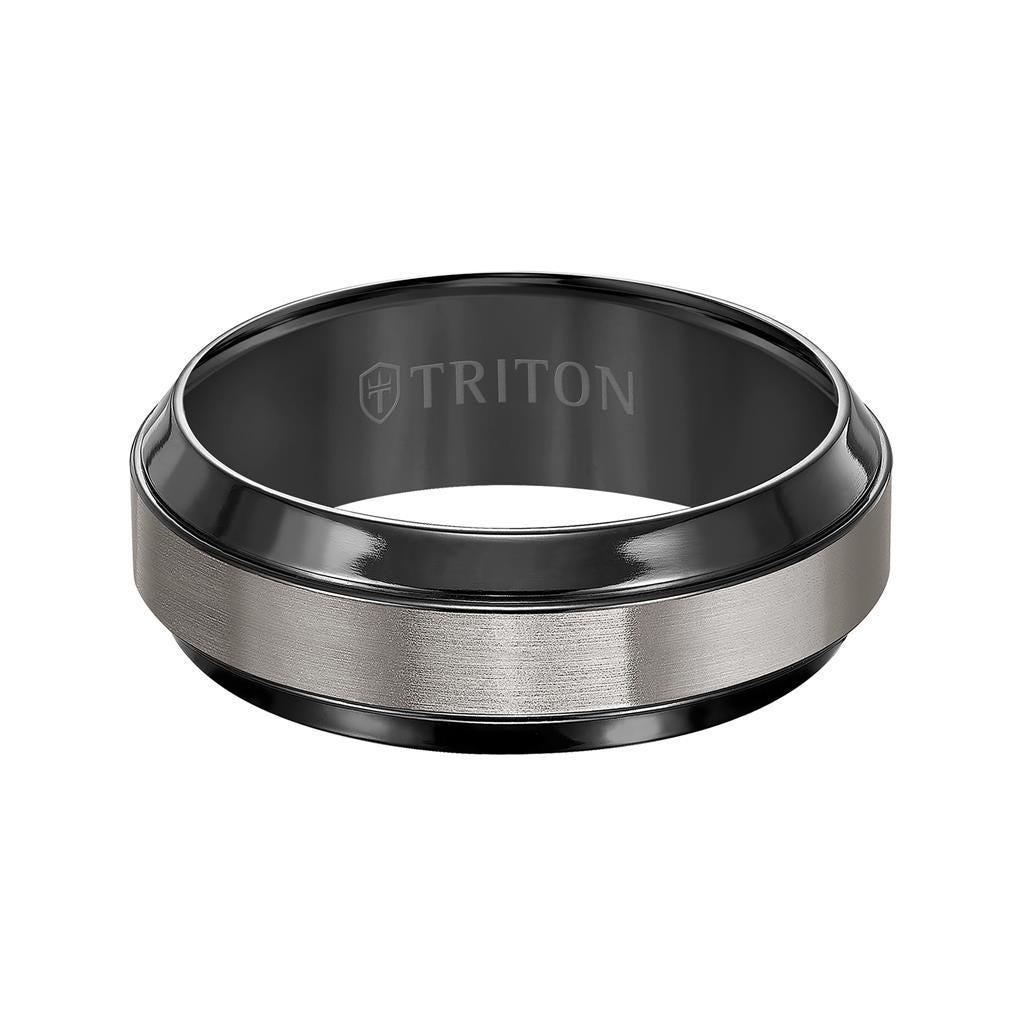 - This 8mm Triton titanium wedding band features a raised center in a beautiful satin finish distinctively highlighted by polished black beveled step edges for an ultra chic look. This is the perfect wedding ring to represent your love and commitment. Larson Jewelers is proud to be an authorized dealer of Triton Rings. Triton Rings is one of the most well known and respected designers of alternative metal rings in the USA. All their rings come with a manufacturer's warranty that covers size exchanges for life, and repair or replacement in case of accidental damage. Note: There is a fee charged by Triton Rings, not us, for all warranty work to cover shipping and handling.