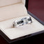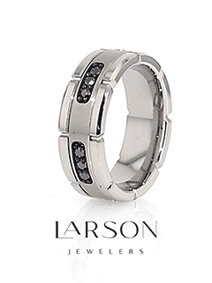 This bold Thorsten Tungsten Carbide ring has a grooved band with polished notches a marvelous silver inlay with inset stunning round-cut, black diamonds. The ring’s nine black diamonds encircle the ring halfway in groups of three.