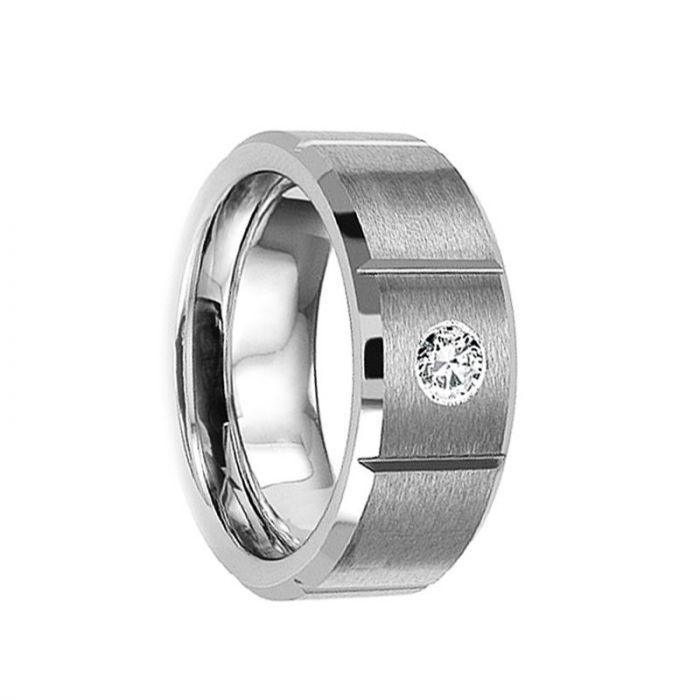 VERGINIUS Brushed & Grooved Tungsten Wedding Ring with White Diamond & Beveled Edges - 8mm