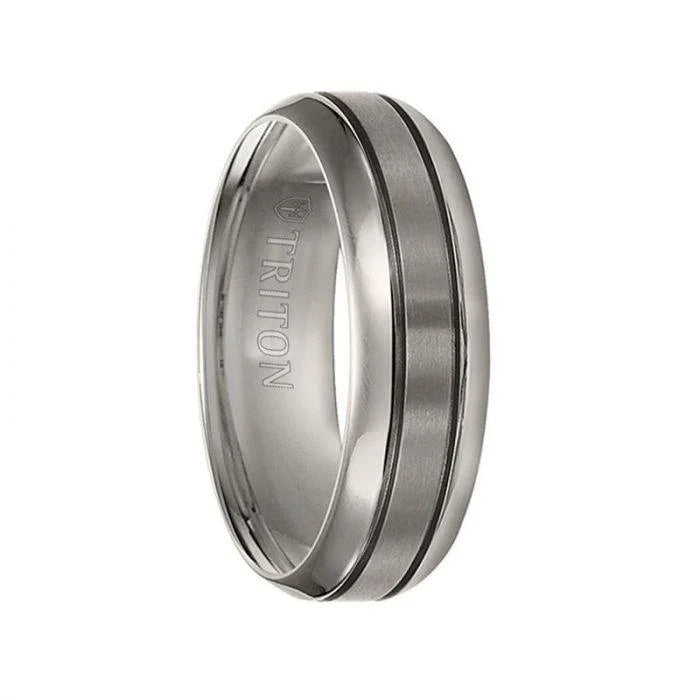 - This 7mm Triton titanium wedding band features a gorgeous satin finish centered between bright polished edges. Offset grooves separate the two rich finishes and complete the elegant design. This is the perfect wedding ring to represent your love and commitment. Larson Jewelers is proud to be an authorized dealer of Triton Rings. Triton Rings is one of the most well known and respected designers of alternative metal rings in the USA. All their rings come with a manufacturer's warranty that covers size exchanges for life, and repair or replacement in case of accidental damage. Note: There is a fee charged by Triton Rings, not us, for all warranty work to cover shipping and handling.